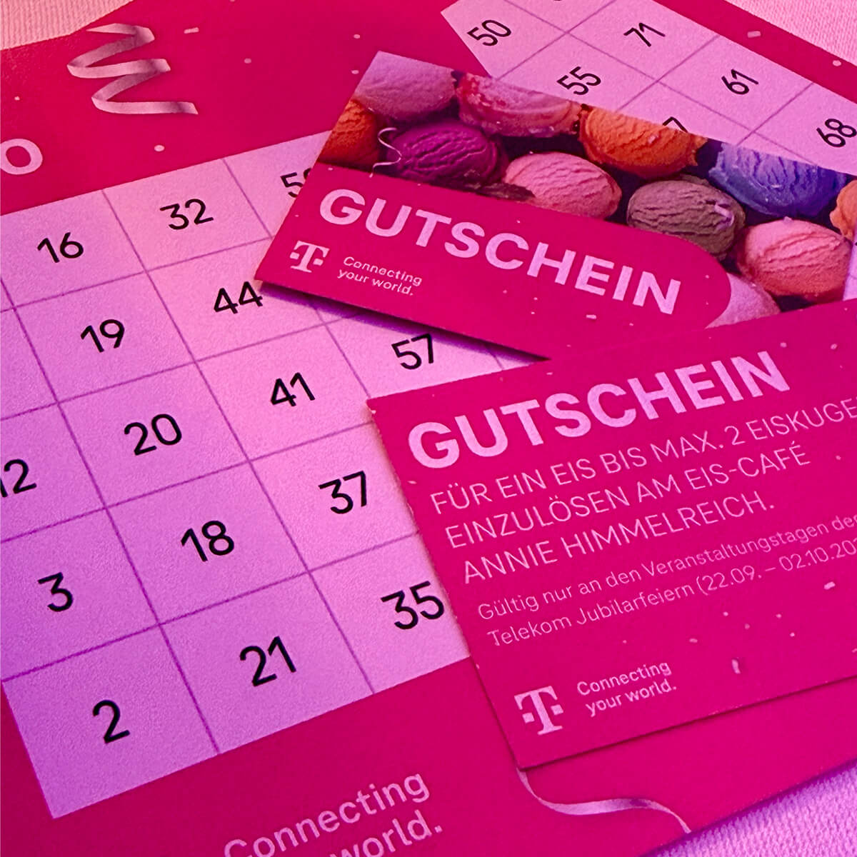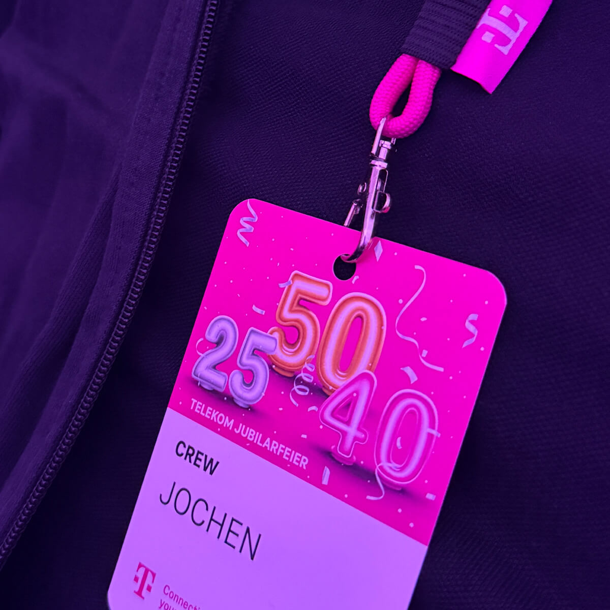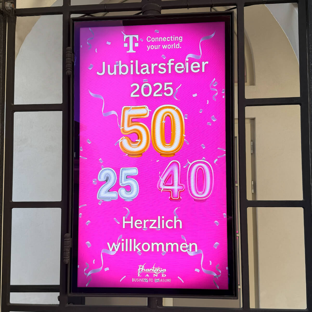 Bei der diesjährigen Jubilarfeier der Telekom standen langjährige Mitarbeitende im Mittelpunkt, die dem Unternehmen seit 25, 40 oder sogar 50 Jahren verbunden sind – ein beeindruckendes Zeichen für Loyalität, Zusammenhalt und Engagement. Als Wertschätzung für ihre Treue wurden die Jubilare zu einem besonderen Erlebnis ins Phantasialand eingeladen, wo sie einen Tag voller Highlights, Emotionen und gemeinsamer Erinnerungen genießen konnten. Wir begleiteten die Veranstaltung mit zahlreichen Elementen – darunter Visuals, eine 360°-Foto-Rückwand, Wegeleitsysteme, Namensschilder, Menükarten, Gutscheine, Bingokarten und vieles mehr.